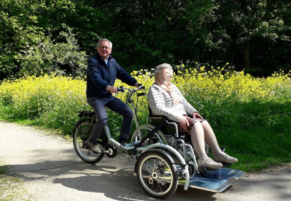 De vrijwilliger gaat volgens rooster al fietsend van de frisse buitenlucht genieten met een rolstoelgebonden bewoner. Hierbij hoort natuurlijk ook het borgen van de veiligheid en het juist inschatten van wat een bewoner met betrekking tot afstand, snelheid etc. aankan.